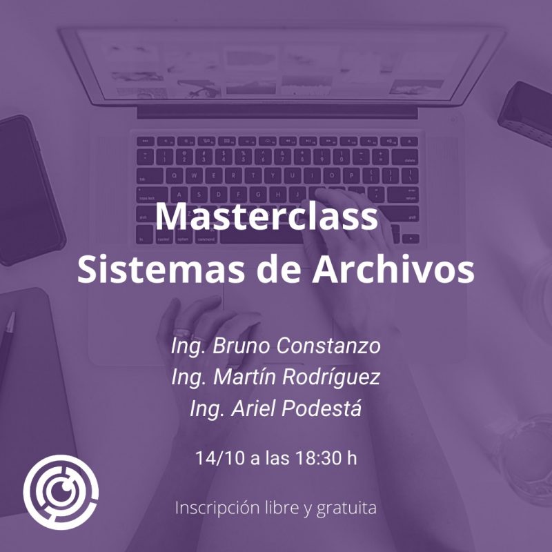 El miércoles 14 de octubre, los Ingenieros en Informática Ariel Podestá, Martín Rodríguez y Bruno Constanzo brindarán una masterclass sobe Sistemas de Archivos.