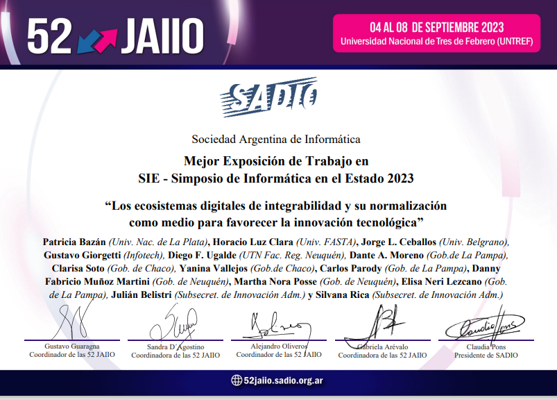 En el marco de las 52ª Jornadas Argentinas de Informática (JAIIO), organizadas por la Sociedad Argentina de Informática (SADIO), la Universidad FASTA fue parte de un trabajo que resultó distinguido con el Premio Nacional de Gobierno Electrónico en la categoría «Iniciativa de Éxito» abordando la propuesta de los ecosistemas digitales de integrabilidad (EDI) y su contribución a la innovación tecnológica en Argentina. Además, durante el evento, el mismo fue reconocido como la «Mejor Exposición de Trabajo en el Simposio de Informática en el Estado 2023».