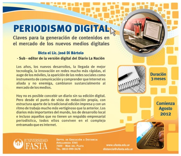 La Secretaría de Extensión de la Escuela de Ciencias de la Comunicación de UFASTA comunica la apertura del Curso de Periodismo Digital que será dictado a partir del mes de agosto.