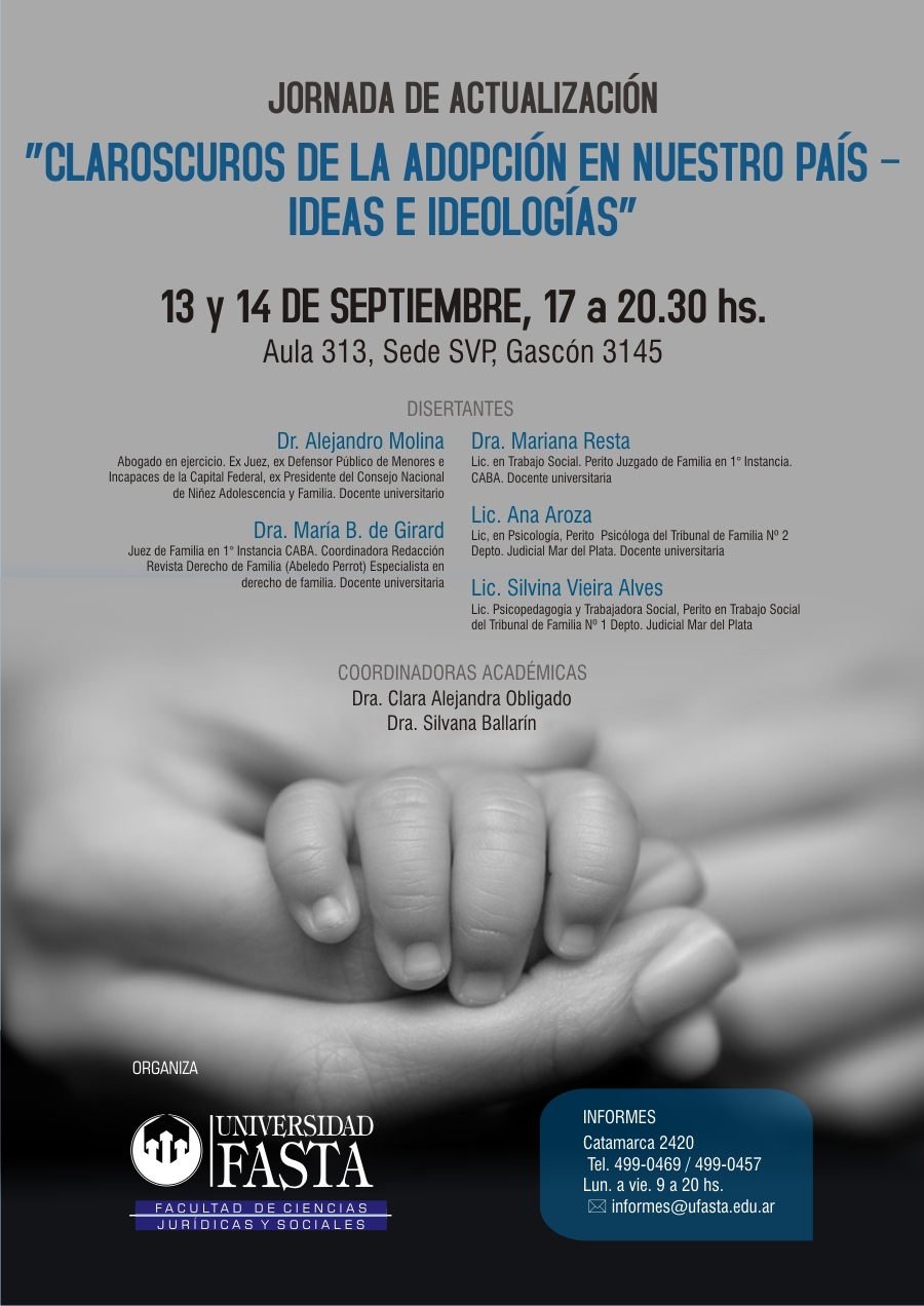 La Facultad de Ciencias Jurídicas y Sociales de la Universidad FASTA invita a la Jornada de Actualización “Claroscuros de la adopción en nuestro país-Ideas e Ideologías”.