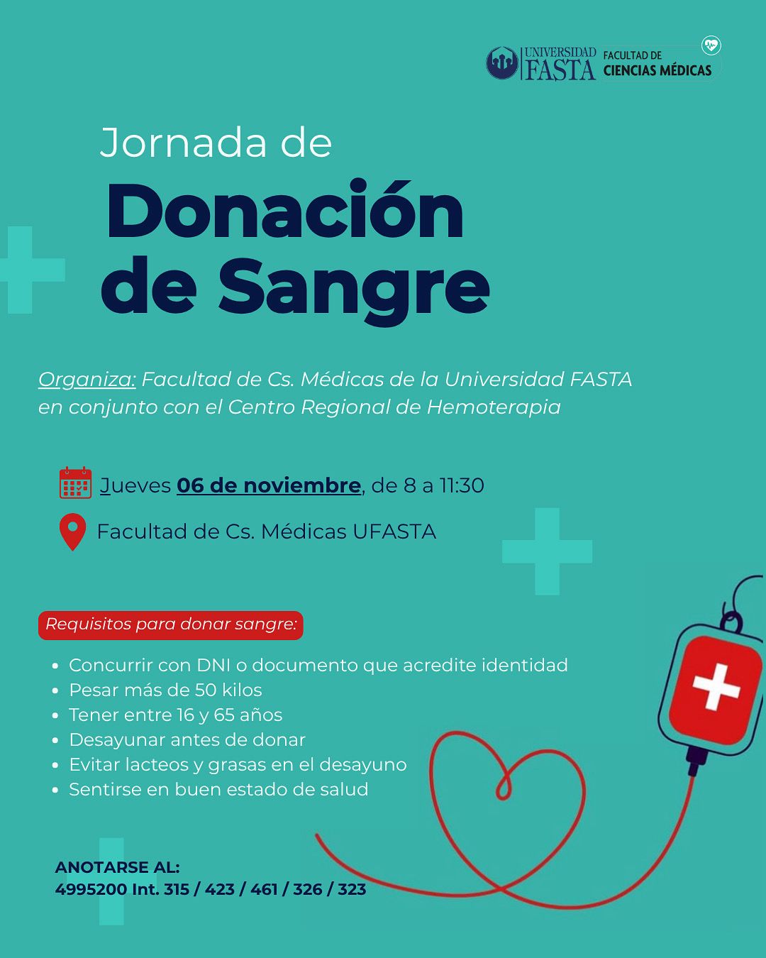 El jueves 6 de noviembre de 8 a 11:30, la Universidad Fasta en conjunto con el Centro Regional de Hemoterapia realizarán una colecta de sangre en el Taller de Kinesiología, ubicado en Avellaneda 3341.